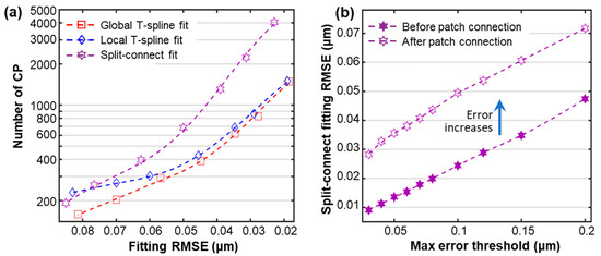 Split-connect has proved to be an order of magnitude faster than classical global algorithms, attributed to the local support ignorance during its initial patch split. However, the final T-spline optimization process reconsiders the local support characteristics of CPs and geometrical continuities between split patches, with the result that initially obtained fitting accuracy cannot hold to the end. An accuracy degeneration phenomenon shown in Figure 5b indicates that the final resulting T-spline’s root-mean-square error (RMSE) is usually twice the value before a final patch connection, and it could be fourfold or even larger than a pre-set maximum fitting error threshold [10]. Therefore, specifying a smaller error threshold is usually required in the initial split fitting to satisfy a final accuracy requirement. However, the support ignorance and the smaller error threshold setting in the initial independent split may easily result in superfluous CPs. Figure 5a indicates that the split-connect fitting may produce over twice the CP amounts of the top-down algorithms in high-accuracy cases.
