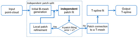 Splines are widely used in interpolation, smoothing, and modeling in computer-aided geometric design, metrology, graphics, and digital signal processing [12]. With the development of powerful node insertion and order elevation algorithms, B-splines and non-uniform rational B-splines (NURBS) have become the mainstream mathematical methods of shape description [13]. B-splines and NURBS are also CAD models in line with industrial standards. Due to the limitation in topology, however, a NURBS surface model may have many redundant control points (CPs), seriously hindering the design of complex geometries. Many improved B-spline variants, such as truncated hierarchical B-splines and locally refined T-splines, which are well known for their adequate local controllability [14,15], have been developed with limited CPs. Among them, Sederberg [16,17] T-splines which allow T-junctions in control meshes could be the most promising options, and as a result of their commercial success, they have been integrated into Autodesk Fusion360. T-splines have received rapid development, given their excellent topological characteristics. Hierarchical T-splines, analysis-suitable T-splines (AST-splines), truncated T-splines, and various modified T-splines [18,19,20,21,22,23] have been developed from there. Recently, they have also been successfully applied to iso-geometrical analyses [23,24]. For these large-scale complex geometry data, existing T-spline fitting algorithms suffer severe efficiency problems compared to NURBS, especially when high fitting accuracy is required. To address this problem, the existing T-spline fitting algorithms must be analyzed regarding their strategic weaknesses.