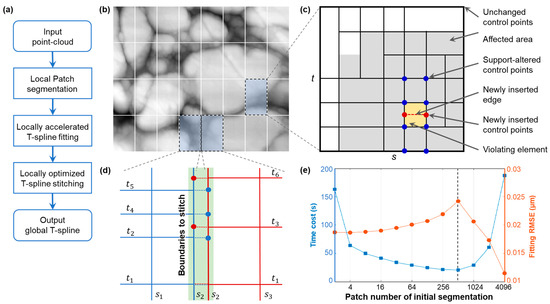 Diagram of LAST fitting algorithm. (a) Algorithm flow chart; (b) independent patch segmentation of a stainless steel surface topography image for local fit; (c) local dimidiate T-spline refinement from a four-CP initial square grid (bold boundaries) and fitting with localized CP topology analysis; (d) stitching at the boundaries of two neighbor T-meshes for locally accelerated final T-spline optimization; (e) computational time cost and fitting RMSE analysis regarding initially segmented patch numbers for the stainless steel surface. In (c), a T-mesh element in yellow is split, and two new CPs in red are inserted. Due to the local support characteristics, only the neighbor (blue) CP-associated blending functions alter. Fitting the local CPs using the local data in the affected grids in grey reduces the complexity of computation significantly; more information is available in the previous work [34].
