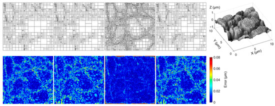 Fitted T-meshes (top) with an RMSE of ~0.02 μm and corresponding fitting error maps (bottom) for a stainless steel surface. Each column from left to right denotes the global, local, split-connect, LAST fitting result, and the 256 × 256-pixel input map, respectively.