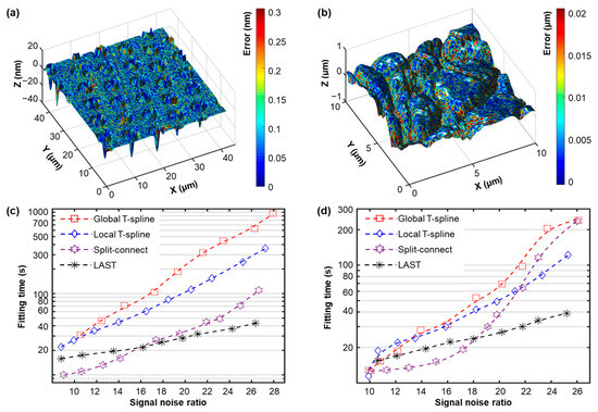where the scalers describing the heights of a z-map surface are one-dimensional versions of and in Equations (1)–(4). Figure 9a,b show the typical fitting results of the laser-patterned surface and stainless steel surface. The adaptively fitted T-splines present relatively uniform Euclidian distance point-to-point errors across the surfaces. Figure 9c,d indicate that for both the periodically patterned and randomly patterned surfaces, LAST fitting achieves excellent efficiency performance against the state-of-the-art fitting algorithms. Specifically, in the low-accuracy fitting scenarios, LAST performs faster than the global and local algorithms but slightly worse than the split-connect algorithm. When the fitting accuracy requirement becomes higher, the split-connect algorithm gradually becomes inefficient because the final PCG optimization is time-consuming in large-scale cases. On the contrary, the LAST fitting gradually becomes the fastest algorithm in high-accuracy cases, thanks to the local support reservation in the fitting calculations.