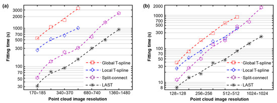 The local computation task may be further accelerated by only using a subset of the input m-point cloud, e.g., by only using the neighbor point sets within the support . Figure 5a shows that the local fitting method reduces fitting time costs to half that of the global method in relatively high-accuracy cases, coinciding with previous studies. In low-accuracy cases, an initial B-spline fit plus limited refinement iterations may converge, with the result that the efficiency superiority could be not noticeable. In addition, the efficiency improvement may also vanish due to the local computation characteristic if a fitted surface does not possess a sparse property [34], e.g., a surface has a uniform random spatial distribution of features, like hills and valleys. In the latter extreme situation or if the required fitting accuracy is very high, the local fitting algorithm may degenerate into a general global one.
