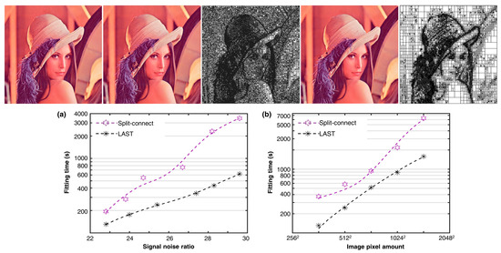We follow the convention of the state-of-the-art research [33] to fit the 8-bit RGB Lena image using the proposed algorithm. Figure 11 (top) presents typical fitted T-meshes of the two algorithms with an equivalent RMSE of 0.03. The results show that the LAST fitting produces a significantly simpler T-mesh than the split-connect fitting using only 80% control points of the latter. An efficiency analysis against fitting accuracy and sample set sizes was conducted. The results in Figure 11 (bottom) show that LAST is about twice to even over fourfold faster than the split-connect algorithm in high-accuracy scenarios.