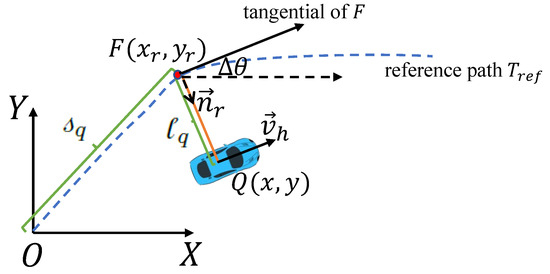Frenet coordinate system conversion takes the road centerline as the reference path and defines vehicle lateral offset as the vertical distance from the reference path. As shown in Figure 2, assuming that the coordinate of the ego vehicle in the Cartesian coordinate system was , the vehicle speed vector was , the reference path was expressed as , and the projection point of the vehicle position to the reference path was , where the s coordinate on the reference line at F is then equal to the s-direction coordinate of the ego vehicle . The coordinates of the ego vehicle’s location and speed in the s-direction are