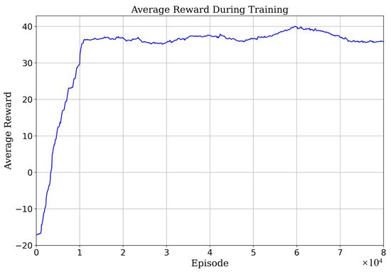 The proposed methodology was trained and tested within a CARLA-based simulation environment featuring a four-lane highway, inclusive of various scenarios comprising both linear and curved road sections. The simulation platform assumes comprehensive knowledge of all road vehicles’ state, enabling access to vital information such as the road’s reference line positioning and lane curvatures derived from HD maps. The vehicles’ physical dimensions are determined as per CARLA-defined models, while environmental vehicle control leverages the CARLA simulator’s native rule-based autonomous driving capabilities. In each training batch, the ego vehicle commences its journey from a randomly generated starting position, progressing for a distance of 500 m or until a vehicular collision is encountered, upon which the round’s reward is computed. The pertinent hyperparameters employed during training are outlined in Table 1. At the onset of each training episode, environmental vehicles are stochastically positioned around the ego vehicle. The learning process is characterized by the average reward, as depicted in Figure 5, illuminating the method’s rapid convergence within a span of episodes.