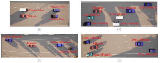 In the case of the straightforward linear road scenario, as illustrated in Figure 6a, the roadway consists of four lanes. At the initial moment, the ego vehicle is positioned in the second lane from the right. Notably, there are three environmental vehicles directly situated ahead, left, and front left of the ego vehicle. The predetermined target speed for the ego vehicle is set at 70 km/h. The behavior decision made by the algorithm dictates a lane change to the right. The lane change process is executed over a duration of 3.9 s, commencing with an initial speed of 31 km/h at the onset of the lane change. The dynamic evolution of the traffic flow, presented in Figure 7, showcases the state transitions at distinct time intervals. The comprehensive analysis of the ego vehicle’s driving trajectory, speed profile, and yaw angle is thoughtfully elucidated in Figure 8. Upon the successful completion of the lane change maneuver, the ego vehicle proceeds to traverse to the designated end point within the newly adopted lane. Throughout this journey, both safety and efficiency considerations are diligently met. This is underscored by the average speed maintained during the entirety of the trip, which attains 48 km/h, while the speed achieved at the conclusion of the lane change approximates the preset target speed, registering at 67 km/h.