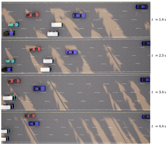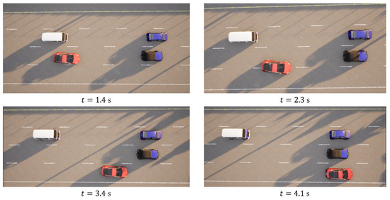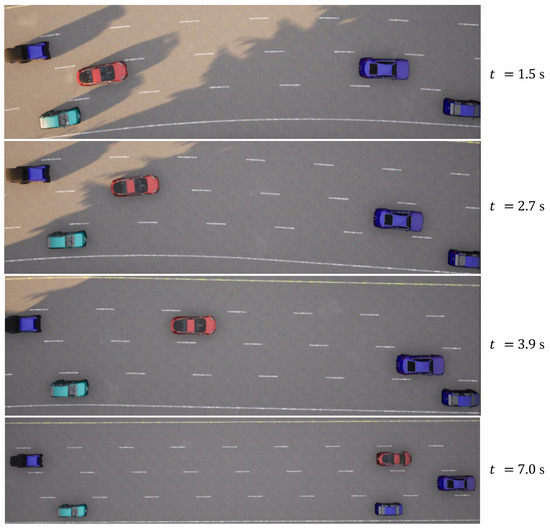 In the case of the intricate linear road scenario, presented in Figure 6b, the road configuration remains consistent with the four-lane layout. Initially, the ego vehicle is situated within the second lane from the left. The roadway scenario consists of four environmental vehicles, distributed as follows: directly in front of the ego vehicle, ahead of the ego vehicle in the right lane, behind the ego vehicle in the right lane, and ahead of the ego vehicle in the left lane. The predetermined target speed for the ego vehicle is established at 70 km/h. The algorithm prescribes a lane change maneuver, directing the ego vehicle to transition to the left lane, subsequently following the vehicle positioned ahead to the left, which is moving at a higher speed. The dynamic progression of the formed traffic flow at varying temporal junctures is meticulously delineated in Figure 9. Further elucidation is offered in Figure 10, comprising a comprehensive analysis of the ego vehicle’s driving trajectory, speed dynamics, and yaw angle. The commencement of the lane change is initiated by the vehicle at a speed of 36 km/h, with the entire lane change operation being seamlessly executed within a time interval of t = 4.4 s. Following the completion of the lane change, the ego vehicle proceeds to trail the preceding vehicle. The journey is marked by an average speed of 50 km/h, culminating in a final speed upon the conclusion of the lane change that mirrors the designated target speed, recorded at 70 km/h.