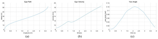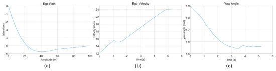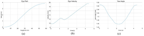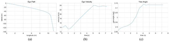 Straightforward linear road traffic analysis of ego car’s (a) driving trajectory, (b) speed, and (c) yaw angle.