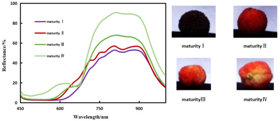 The UHD-185 hyperspectral imager was used to collect hyperspectral images of bayberry under natural light conditions in the field. The UHD-185 hyperspectral imager has a spectral resolution of 4 nm, a sampling interval of less than 100 μs, and a spatial resolution of 1mm within the wavelength range of 454 nm to 998 nm [17]. Hyperspectral images were collected using the Spectralon® (North Sutton, NH, USA) standard diffuse reflectance whiteboard before measurement to calibrate the hyperspectral images and a tripod was used to allow the UHD-185 to capture the hyperspectral images of bayberry in a fixed position. The following figure shows the spectral characteristics of four different grades of bayberry, and grade I is the optimal one.