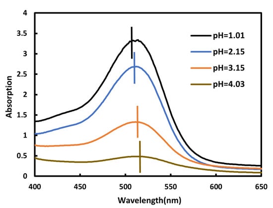 Figure 1 shows the spectral reflectance of four different grades of bayberry fruits at 454–998 nm. It can be concluded from this figure that the tendencies in spectral reflectance of different grades of bayberry fruits are basically consistent. There is a significant difference in spectral reflectance in the band of 530–630 nm, and its trend is consistent with the change in grade of bayberry fruit. The distinction between different grades in the bands after 750 nm is also relatively obvious, but the trend of spectral changes is inconsistent with the trend of grade changes. There is a reflectance peak between 550 and 650 nm, and this peak will decrease with the improvement of bayberry quality. In high-quality bayberries, this peak basically disappears. At the same time, in Figure 1, we can observe that the peak position will shift to the left as the quality of bayberry improves. The shift of anthocyanin absorption peak may be caused by changes in pH. This is a similar phenomenon in the PROSPECT-D of F é ret and J. B, where the absorption peak position of anthocyanins changes with pH value [27]. We conducted experiments on this and measured the absorption spectra of bayberry solutions adjusted to different pH values using hydrochloric acid and sodium hydroxide. Figure 3 shows that the absorption peak positions of bayberry solutions at different pH values make a significant shift, and as the pH value of the bayberry solution increases, the absorption peak of the bayberry solution absorption spectrum shows a significant right shift trend. There is a certain relationship between the pH values of the spectrum of bayberry. This indicates that it is feasible to establish a pH model for bayberry fruit using spectroscopy.