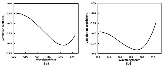 Calculate the correlation coefficient between the reflectance and anthocyanin content of bayberry at 530–630 nm, as shown in Figure 5a. From Figure 5a, the highest correlation coefficient is 0.81 at 610 nm. At this band, the correlation between reflectance and anthocyanin content is highest. Therefore, the band of reflectance was selected as 610 nm. Calculate the correlation coefficient between the reflectance and pH value of bayberry at 530–630 nm, as shown in Figure 5b. From Figure 5b, the correlation coefficients are high at 560–620 nm. Considering the low-cost of subsequent instrument development, the reflectance band was selected as 570 nm for inversion.