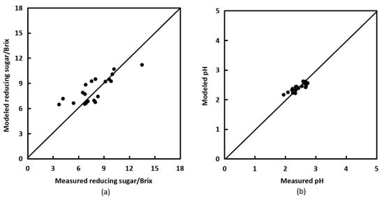 Comparison of modeled and measured values of reducing sugar (a) and pH (b).