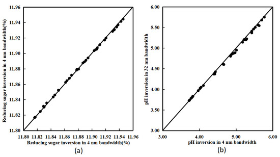 The pH inversion results with different bandwidth (a) and reducing sugar content inversion results with different bandwidth (b).