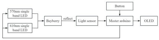 As shown in Figure 11, the Arduino main control board is controlled by touching the switch. After detecting that the key is closed once, the Arduino main control board will carry out the detection work. The specific control is as follows: First, power LED1 and power off after 1 s, and power LED2 for 1 s after 1 s. The data acquisition of the light intensity sensor is controlled according to the power switch of the two LED lights. When the two light sources are powered separately, the light intensity sensor will collect 1 s data synchronously and pass the collected reflected light data of the two light sources to the Arduino main control board, respectively. After receiving the two light data, the Arduino main control board will output the test results according to the calibration results and the sugar and acidity detection model. The two light dates are taken as the 570 nm reflection information and 610 nm reflection information. respectively, and in proportion to the calibration results of the two light sources to obtain the reflectivity information, which is further brought into the detection model and output to the display module. After receiving the information, the display module outputs it on the display screen, and the visual results include the sugar and acidity detection results of the bayberry fruit.