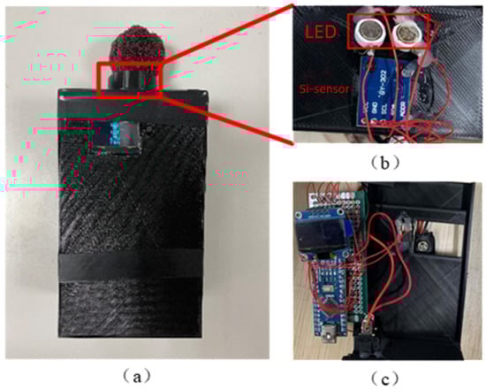 Schematic diagram of the portable bayberry quality detector ((a) Overall diagram of the instrument; (b) Light source and detection part; (c) Internal structure).