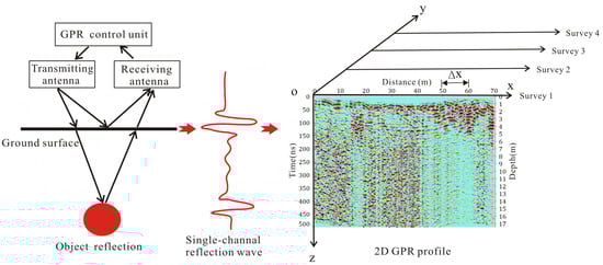 GPR is a nondestructive geophysical technique to image the shallower buried structures using high-frequency electromagnetic waves [,]. Subsurface structures on the GPR data are interpreted by changes in the radar waveform and relative amplitude. As shown in Figure 2, when the GPR antenna is moved, the transmitting antenna emits a series of electromagnetic waves into the ground. Once electromagnetic pulses encounter the material’s changes in different dielectric and electric properties, some of the electromagnetic energy will return to the receiving antenna and other portions will transmit into deeper layers. The reflection electromagnetic signals are amplified and displayed on the screen with a single-channel reflection wave. As the GPR antenna is moved along the survey lines, a serial of sequential single-channel reflection waves are collected and displayed on a gray or color 2D radargram, which is an XZ profile. In view of the working principle, the spatial coordinate system of the GPR data can be set up as shown in Figure 2 []. The x axis shows the antenna’s displacement along the GPR measurement lines, the y axis represents the number of the GPR survey lines, and the z axis indicates the two-way travel time of the radar reflection waves. If the velocity of electromagnetic waves in the underground media is known, the depth position of electromagnetic waves can be determined using time–depth conversion [].