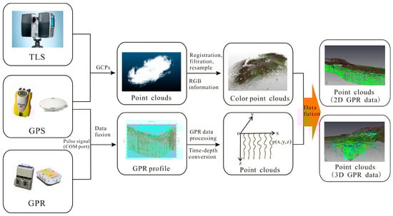 Generally, it is difficult to obtain detailed surface and subsurface information for 3D detailed virtual reconstruction using conventional surveying methods. Advanced technologies such as TLS and GPR have been increasingly used to acquire high-resolution geomorphic features and shallow geometry in many fields. TLS is capable of providing various levels of point clouds to delineate real-world objects or environments with a highly automated and non-contacted operation. GPR is a nondestructive geophysical technique to image the shallower buried structures using high-frequency electromagnetic waves. However, the TLS and GPR methods have their own advantages and drawbacks. It is clear that the shallow geometry of subsurface materials cannot be obtained by the TLS without an intrusive intervention. In addition, the understanding of GPR data is unintelligible considerable the remarkable variation in radar waveforms and relative amplitude. Therefore, it is worth paying great attention to implementing data integration of TLS and GPR for comprehensive identification and analysis. Compared with single TLS or GPR data, the advantages of fusion data of TLS and GPR are summarized as follows: (1) it offers multisensor and multiscale spatial data for the comprehensive identification and analysis of surficial and subsurface information; (2) shallower buried structures obtained by the GPR will be better interpretated and understood with the help of their corresponding superficial spatial data.