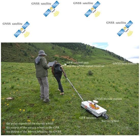 In order to obtain high-resolution position information of the GPR data, an integrated GPR and GNSS system was applied to collect the GPR data and their geographical coordinates [,,,,]. As shown in Figure 4, this system mainly includes the GPR control unit, the transmitting antenna, the receiving antenna, the survey wheel, the GNSS base station, and the GNSS mobile station. When the GPR antenna was pulled on the surface, the pulse signals of the survey wheel were used to trigger the GPR control unit and the signal receiver of the mobile GNSS station simultaneously. Once a pulse signal reached the GPR control unit, the transmitting antenna emitted an electromagnetic signal into the ground and a single-channel reflection wave was recorded in the GPR system. Meanwhile, the position information of the single-channel reflection wave was recorded in the signal receiver of the GNSS mobile station, such as the geographical coordinates (longitude, latitude, and altitude) and GNSS time. Due to the GPR system and the signal receiver of GNSS being simultaneously triggered by the pulse signals of the survey wheel, the pulse events of the GNSS should be well aligned with the trace of the GPR data. Nevertheless, the trace interval and antenna frequency of the GPR were set before data collection, and it was troublesome that the trace interval was almost perfectly aligned with the calibration of the survey wheel. Therefore, in view of the trace interval and wheel calibration of the survey wheel, a time synchronization algorithm was adopted to achieve data fusion of each trace of the GPR data and the geographical coordinates of the GNSS signal receiver using the GNSS time as a references [].