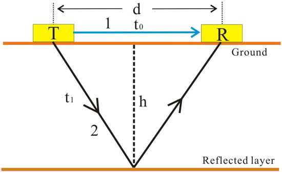 For revealing more realistic propagation characteristics of electromagnetic waves, an improved propagation model of electromagnetic waves is illustrated in Figure 5. Compared to Equation (5), the antenna separation and the direct waves in the air were both valued. Considering the polarization characteristics of GPR antenna, the scattering energy of electromagnetic waves can be ignored when the electromagnetic waves are spreading in the media. In this case, the propagation path of electromagnetic waves mainly includes the direct wave in the air and the reflection wave in the ground, paths 1 and 2, respectively, as shown in Figure 5.