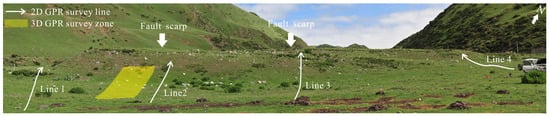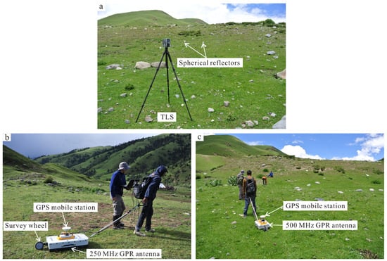 For evaluating the feasibility and validity of the integrated TLS and GPR method, TLS and GPR (250 MHz and 500 MHz antenna) surveys were implemented to delineate the surface and subsurface geometry of the fault scarp in the Litang fault (30.23° N, 99.86° E). As shown in Figure 6, geomorphic features of the fault scarp were clearly distinguished by topographic change [,], and the study site was suitable for evaluating the integration of TLS and GPR to delineate the surficial and subsurface information.