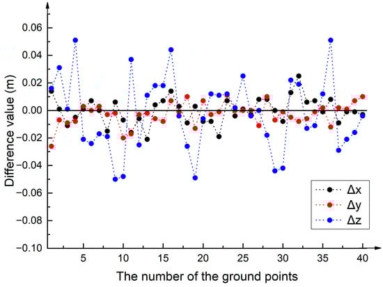 Difference values of the common points between the TLS-based and GPR-derived point clouds. Black dots represent the difference values in the x direction, red dots indicate the difference values in the y direction, and blue dots represent the difference values in the z direction.