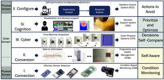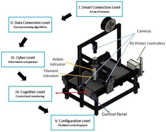 A large-scale 3D printer with a printing area of 610 mm × 1222 mm × 450 mm in the X, Y, and Z axes, respectively, was integrated in a CPPS. The 5C-level architecture proposed by [40] was implemented as a base manufacturing system for industry 4.0. Figure 1 presents the FDM system and the five levels. This study focuses on levels I, II, and III.