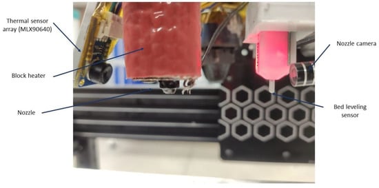 The first-level, smart connection belongs to the physical domain; the data are measured by an array of sensors deployed on the printer. In total, there are sixty different parameters being monitored using different sensors such as RGB and infrared cameras, accelerometers, thermocouples, and humidity, current, and voltage meters. Since the experiments carried out have the objective of studying the relationship between parameters, the deposited material temperature, and the ultimate tensile strength, the main sensor used was a 32 × 24-pixel small-size thermal sensor array (MLX90640). This was used to measure the temperature of the extruded material along with the remainder of the sensors in the system; its location can be seen in Figure 2. The camera is coupled to the printer head moving along with the nozzle; in this way, the pixels of interest are always fixed, and the local temperature at each polymer fused deposition line is traced.