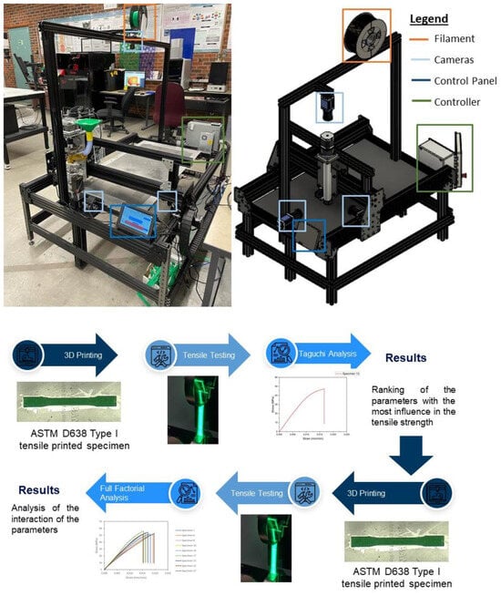 In additive manufacturing, in order to achieve mass production with controlled parameters and continuous quality outputs based on the mechanical properties required, process adjustments mostly depend on the interaction of printing parameters, material properties, and printer characteristics [1,2]. Therefore, tuning additional or individual parameters for the development of each product is time consuming and uses resources, producing waste either due to human error or machine variations [3]. Most of the time, these adjustments should be intuitive and user-friendly, but for a large fleet of printers with multiple part productions, this task seems impractical without utilizing any decision support system. For this purpose, the implementation of cyber–physical production systems (CPPSs) based on machine learning models (MLs), data science, and material properties knowledge-based models serve as the optimal solution. Suppose we consider the current state-of-the-art fused deposition modeling (FDM). It lacks automatized quality control tools and printing condition feedback systems, and it operates in an open loop due to the lack of conditions to adjust accordingly [4]. In this area, there have been studies applying novel image processing tools such as artificial intelligence combined with arrays of sensors to address and mitigate print failure, reducing waste, cost, and production time [4,5,6].
