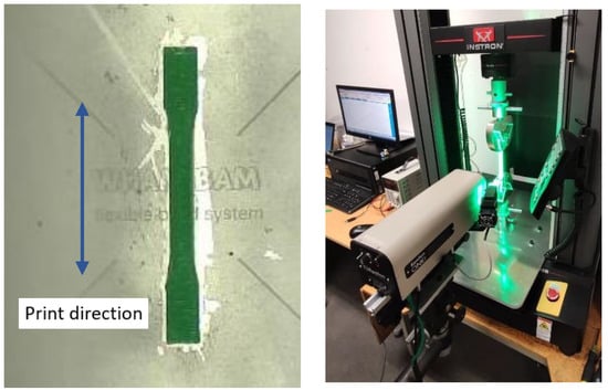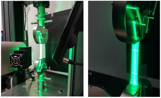 The equipment used to conduct the destructive test can be seen in Figure 5; an Instron 5966 with a load cell of 10 kN and a gripper with a maximum load of 5 kN were used. The test was performed at a displacement rate of 1 mm/min. To measure the axial strain, an Epsilon ONE camera was used, which followed two marks on each side of the specimen, as can be seen in bottom right corner of Figure 6.