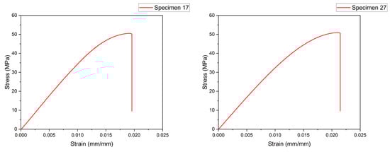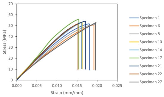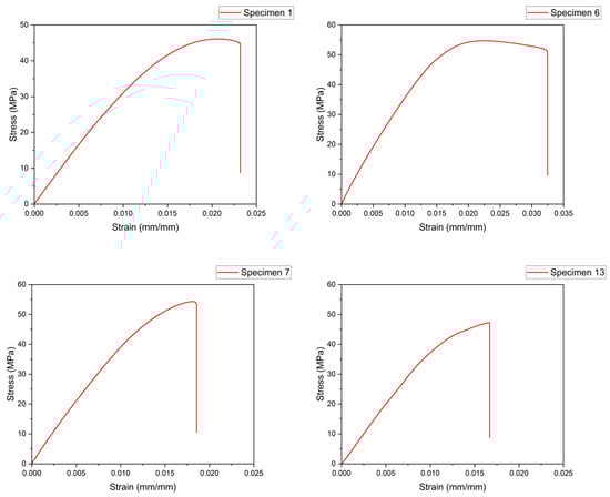 After printing the 27 specimens, the destructive test was carried out, and the stress–strain curves were plotted; some of them can be seen in Figure 7. Then, the ultimate tensile strength was obtained for each test, which is the maximum stress in the stress–strain curve.