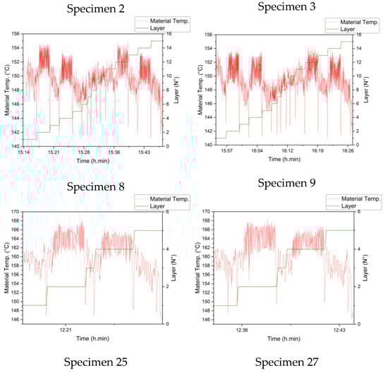 The CPPS was used to store the data related to each specimen; they were printed one at a time. The local fused temperature of the extruded material was plotted; some profiles can be seen in Figure 8, where specimens 2 and 3 are part of experiments 1, 8, and 9 in the first and second graphs, respectively, and specimens 25 and 27 are part of the fifth and sixth graphs, respectively. In general, it can be observed that there was not much of a difference between the different printed parts in the same experiment, which is supported by the low variance in the UTS of specimens with the same combination. It is also noticeable that the local fused temperature of the extruded material is lower than the heater block temperature; this difference is tabulated in later sections. Finally, for every layer change, there is a sudden drop in the temperature due to the nozzle moving away from the part to take the pictures without visual obstructions.