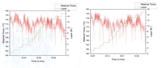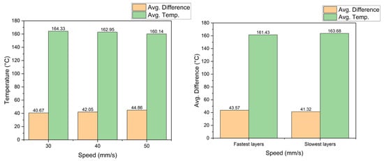 Regarding the analysis of the printing speed, the right side of Figure 16 shows that as the speed increased, the temperature of the material decreased, and the difference between the actual and the desired temperature increased. Next, the average temperature values of the fastest and slowest layers of each of the printed specimens were taken in order to compare the results; these are shown on the right side of Figure 16. The fastest layers reached an average of 161.43 °C and 163.68 °C for the slowest layers, representing a difference of 2.25 °C, which is 1.39%. It can be concluded that the faster the filament passes through the heater block, the lower the temperature of the material in the nozzle will be because there is less time for heat transference and possible material thermal conductivity properties.