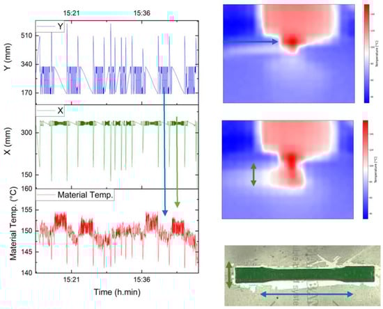In a more detailed observation, the temperature varies widely at around almost 10 °C of difference, and considering the points where the nozzle moved away to take the images, this difference is even greater. From the layer line, it can be noticed that even layers reach a higher temperature than odd layers; this phenomenon can be explained by studying the thermal camera videos that focus the nozzle. The path follows a grid pattern of 0 and 90°, where the odd layers are at 0° (movement on Y), with a longer path along the axis of the dog bone specimen, giving enough time for the material to cool down. This is in contrast to the 90° (movement on X) layers, where the path is much shorter, so not only does the layer not cool down, but it also has more influence from the adjacent layers. Figure 9 shows this pattern along with the registered movements in X and Y; a clear relationship can be seen. These findings indicate the influence on the process of the tool path, from a thermal point of view.