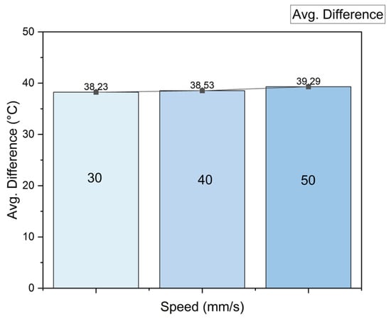 For the three levels of speed, the average temperature per layer and the difference from the requested temperature were calculated; the results can be seen in Figure 10, where the faster the nozzle moves, the cooler the material is. The temperature falls because the heater block has less time to melt the filament; thus, the difference in the requested temperature increases. This result is interesting because this parameter ranked second in Taguchi’s analysis, but comparing the temperature, there is only one degree of difference from 30 to 50 mm/s, which represents 2.69%; its influence on the temperature is less than the influence of the bed temperature, which leads one to think that the improvement in the UTS due to printing speed is not only related to temperature.