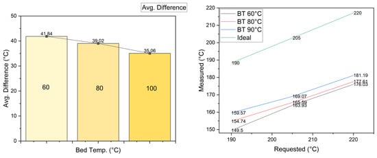 For the bed temperature, the data acquired by the CPPS is shown in Figure 11. On the right side of the graph, the bar shows the average temperature difference in the deposited material for each level of the temperature of the bed; it can be seen that as the bed temperature increases, the difference is reduced, with a 6.78 °C difference from 60 °C to 100 °C, down to a 5.6% difference. The right side of Figure 11 presents a comparison against the ideal (requested) temperature. The bed temperature influences the temperature of the layers. However, considering the result of the Taguchi analysis, since this parameter has the lowest influence, the result is 5.6%, compared to 2.69% for the printing speed. The bed temperature does not have a large influence on the UTS.