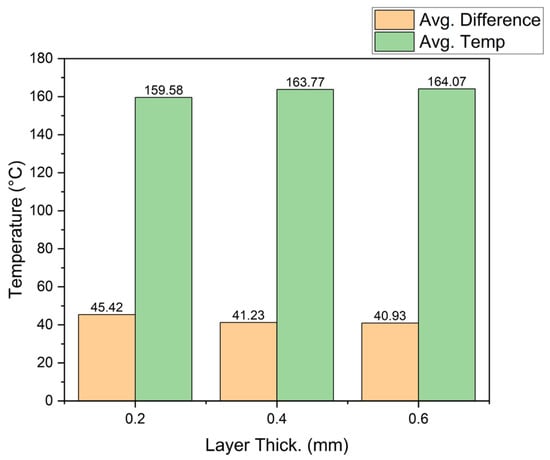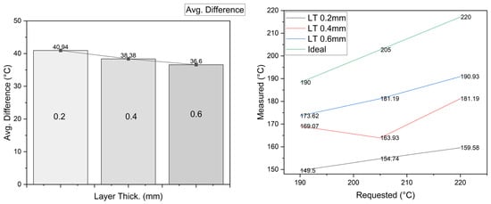 Using the data collected with the CPPS, the average local fused temperature of the extruded material and the difference compared with the requested temperature was calculated for each layer thickness; this can be seen in Figure 15. Similar to the conclusions found with the Taguchi analysis, as the layer thickness increased, the average temperature also increased, reducing the difference between the actual and the requested temperature. From layer thicknesses of 0.2 to 0.6 mm, there is 4.49 °C of difference or 2.81%. This relationship could influence the increase in the UTS value.