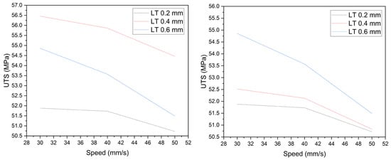 Figure 14 plots the results of Table 7; on the left side is the UTS average where the curve for the layer thickness of 0.4 mm exceeds 0.6 mm due to the extra 0.2 mm thickness; on the right side, the adjusted values represent the 0.6, 0.4, and 0.2 mm layer thicknesses in descending order of the UTS. For the three-layer thicknesses, the drop in the UTS value is not linear since the slope from 30 to 40 mm/s is less significant compared to the slope from 40 to 50 mm/s. In terms of the changes in UTS, they are not linear either, since the increase from 0.4 to 0.6 mm is at least three times greater than the increase from 0.2 to 0.4 mm. The three curves show a defined trend, corroborating the validity of the results. In the next section, we will seek to relate this behavior to the thermal interaction that occurred during printing.