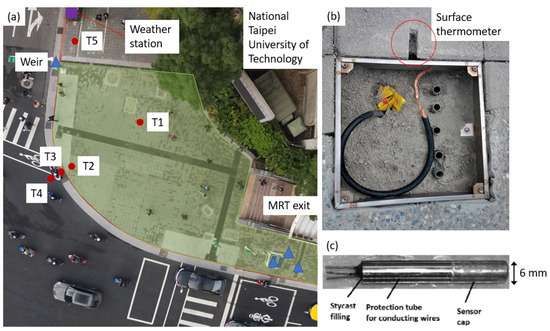 Five temperature-monitoring points were installed: T1, T2, T3, T4, and T5, with T1 and T2 at the pervious site. At each of T1, T2, T3, and T5, five PT1000 thermometers (WIKA Instruments, Taoyuan, Taiwan) were installed at different depths (0.09 m, 0.17 m, 0.24 m, 0.32 m, and 0.36 m) through shafts visible in Figure 1b, and one was installed at 0.015 m depth through a surface notch (indicated with a red circle in Figure 1b). The specification of the PT1000 thermometer (Figure 1c) is provided in Table 1. T4 had only the surface temperature measured.