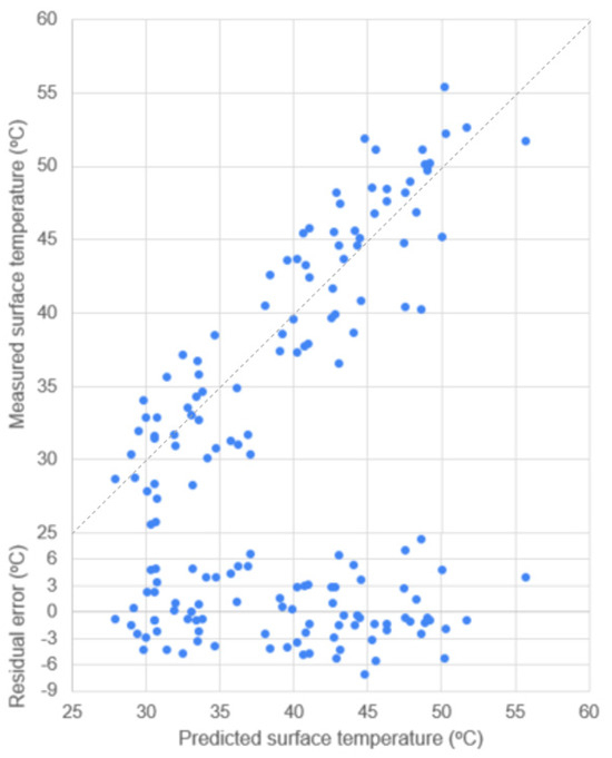 Scatterplot of data points of predicted vs. measured surface temperature and residual error for the impervious paver with R2 = 0.84 (dash line is 1:1).