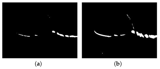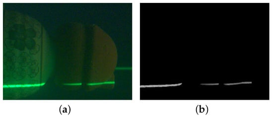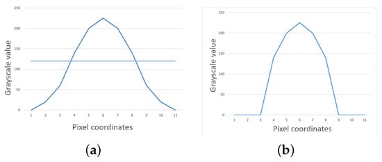 Figure 10. Grayscale threshold segmentation illustration. (a) Before threshold segmentation, (b) after threshold segmentation. - The grayscale gravity method is used to calculate the center of the laser stripe of the threshold segmented; the equation for the coordinates of the center of gravity (u, v) of the light stripe cross-section is shown in Equation (8).where, in each case, T is the dynamic grayscale threshold of the structural light’s stripe image, , are the pixel coordinates of the kth pixel in the image, is the gray value of the kth pixel in the image, n is the number of points greater than the threshold value, and the value of k is in the range from 0 to n.