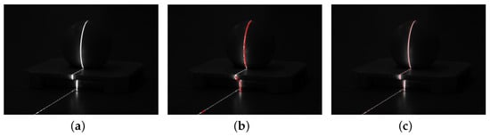 We use the grayscale gravity method and the normalized grayscale gravity method to extract the center of the laser stripes on the surface of planar underwater objects, as shown in Figure 16a. Since the regular surface has good flatness, the coordinates of the line centroids of the regular surface can be used to compare the accuracy of the different algorithms. Figure 16b,c use the normalized grayscale gravity method and the grayscale gravity method, respectively, to extract the center of the laser stripes, both of which can be performed quickly and efficiently.