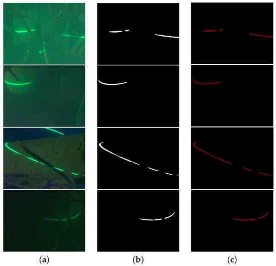 Baseline evaluations with state-of-the-art deep learning segmentation models show that good results (Table 3) can be obtained for all selected models. Moreover, all models show similar convergence behavior, as shown in Figure 6. Table 3 presents the results of the benchmark evaluation. According to the table, Pspnet using a ResNet101 backbone provides the best results for underwater laser line segmentation with an average IoU of 88.95 and an average score of 93.80. The inference time of the FastSCNN model shows the best time of 43.8 FPS. The visualization of the test set, according to the above model, to segment the image is shown in Figure 7.