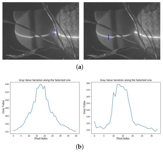 When analyzing the underwater image, the gray levels of different columns along the cross-sectional direction of the laser stripe are extracted and compared, and the gray levels of the image vary significantly when Fresnel scattering is present, as shown in Figure 2.