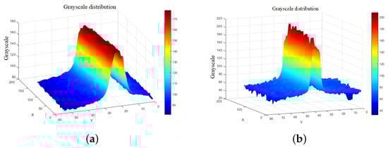 The laser stripe extraction center was selected at different positions in the form of pixels or pixel blocks and was performed row-by-row or column-by-column, as shown in Figure 8. The gray cross-section of the stripe does not comply with the Gaussian distribution due to the superposition of the laser’s second-order diffraction scattering, which leads to multiple saturation of the image and the appearance of a gray distribution jump. The laser stripe center region has high energy, and the upper part of the Gaussian curve is flattened. There is a significant difference in the distribution of grayscale between a uniform, smooth surface and a rough surface, which is shown in Figure 9. This three-dimensional illustration demonstrates that in a uniform, smooth plane, the grayscale distribution changes less, and the energy is mainly concentrated in the center. However, on a rough surface, the grayscale changes significantly, and the energy distribution is extremely uneven. This is due to diffuse scattering on the rough surface, which causes an unbalanced capture of light by the camera lens. Comparing the two images, the center part of the light stripe is flatter in the rough plane, the energy distribution is more widely scattered, and the jump in the cross-section is larger, which requires higher accuracy for extracting the center of the light stripe.