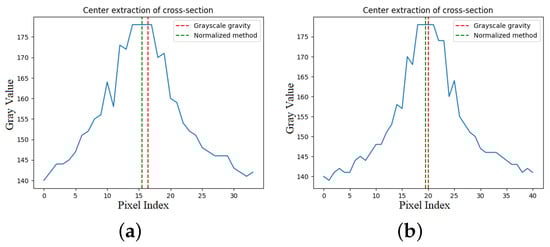 The region of interest in Figure 11b can eliminate the light stripes in the background and extract the grayscale values of object surfaces with different roughnesses. Our proposed method can eliminate the threshold segmentation step while retaining better edge information, which also leads to more extracted information in the cross-section. To reduce the influence of too many edge point grayscale values on the center point, we improve the traditional grayscale gravity method by using the normalized grayscale center of gravity method (10) to strengthen the weighting of extreme values and reduce the weighting of edge points to make the center extraction more robust and converge better.