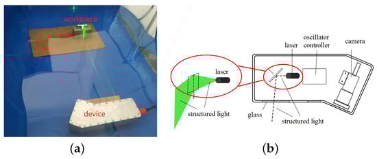 Diagram of laser scanning measuring device. (a) Physical picture of device, (b) device schematic diagram.