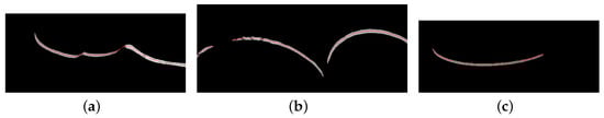 In Figure 15, we extract the light stripes center for a 365 × 520 pixel photo. From Table 4, which shows the comparison of the three different methods, we know that by determining the region of interest by semantic segmentation comparison of thresholding segmentation, the number of center points of the light stripe increases significantly. The template method obviously takes longer and has a larger computational cost, while the remaining two perform well.
