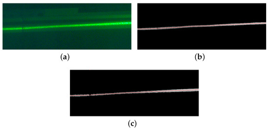 The grayscale gravity method [10] is based on the characteristics of the grayscale distribution within the cross-section of each row of laser stripes and extracts the grayscale centroid of the laser stripe region by computing line-by-line in the direction of the line coordinates. This reduces the error caused by the uneven grayscale of the laser stripes and is fast, but requires that the grayscale is Gaussian-distributed and susceptible to noise. The curve fitting method [11] uses a Gaussian curve or parabola to sketch the grayscale distribution of the laser stripe’s cross-section. The center of the cross-section is the local maximum of the fitted curve; this method is only applicable for wide laser stripes with constant normal vector direction. In addition, the actual grayscale distribution of the pixels in the laser line is not strictly symmetrical, so the extreme points found by curve fitting are often not in the actual center of the laser line. The Hessian-matrix method [12,13] of the laser stripe normal vector direction is derived from the eigenvectors corresponding to the eigenvalues of the Hessian-matrix. The subpixel center coordinates of the laser line are calculated by applying the Taylor expansion in the normal vector direction. The Hessian-matrix method is characterized by high noise insensitivity, accurate extraction, and good robustness, and it has obvious advantages under the conditions of complex environments and high precision requirements. However, it generates redundant center points in wider cross-sections and is less satisfactory because of the high real-time computational cost.