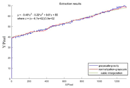 Our proposed normalization of the grayscale using an exponential function normalizes the grayscale values to an exponential growth trend, which means that a small change on the x-axis leads to a large change on the y-axis, and this function curve allows the output values to be kept at a distance, increasing the weights of the grayscale extremes and decreasing or even ignoring the grayscale weights of the boundary points. Then, the grayscale value and pixel coordinates of each row or column are obtained by iteratively going through them and brought into Equations (10) and (11) to calculate the floating-point data value of the laser stripe center coordinates, which is the sub-pixel center point.