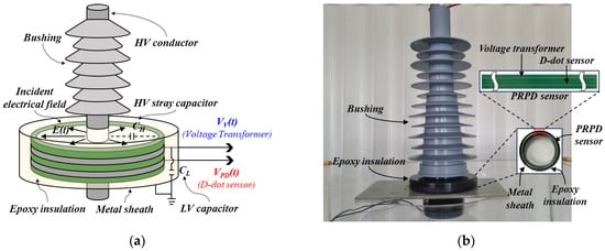Figure 1 shows a configuration and photograph of the prototype PRPD sensor embedded in a MV-class bushing. The PRPD sensor was designed using a non-contact detection method. The dual-sensing electrodes consisted of a voltage transformer (VT) for voltage signals with a commercial frequency band (around 60 Hz) and a D-dot sensor for PD pulses with high-frequency ranges, respectively. The electrodes were installed on a flexible PCB to encircle the HV conductor and minimize external environmental impacts such as shock or vibration. The main manufacturing process of PRPD sensors consists of the following steps: Initially, the PRPD sensor is designed and fabricated on a flexible PCB by calculating the geometric parameters and insulation distance. The PRPD sensor is then embedded within an epoxy-insulated metal enclosure to minimize the influence of unexpected external electric fields. Finally, the PRPD sensor, housed in a metal enclosure, is installed in a MV-class bushing.